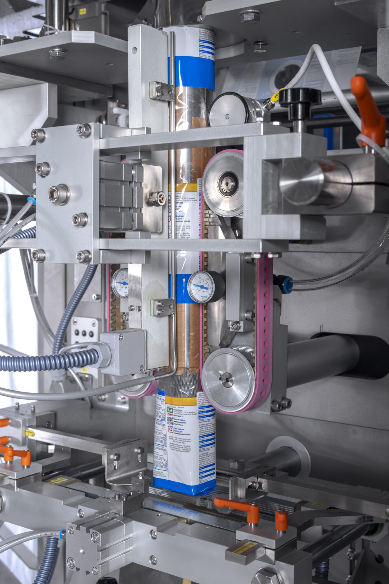 Hotové sáčky dále procházejí jednotkou TSH, která aplikuje etiketu pro opětovné uzavírání – ideální řešení pro produkty s opakovanou spotřebou, jako jsou luštěniny. Následuje přesun na wrap-around kartonovací stroj, který kompletuje skupinové balení a zajišťuje jeho pevnost a estetický vzhled.